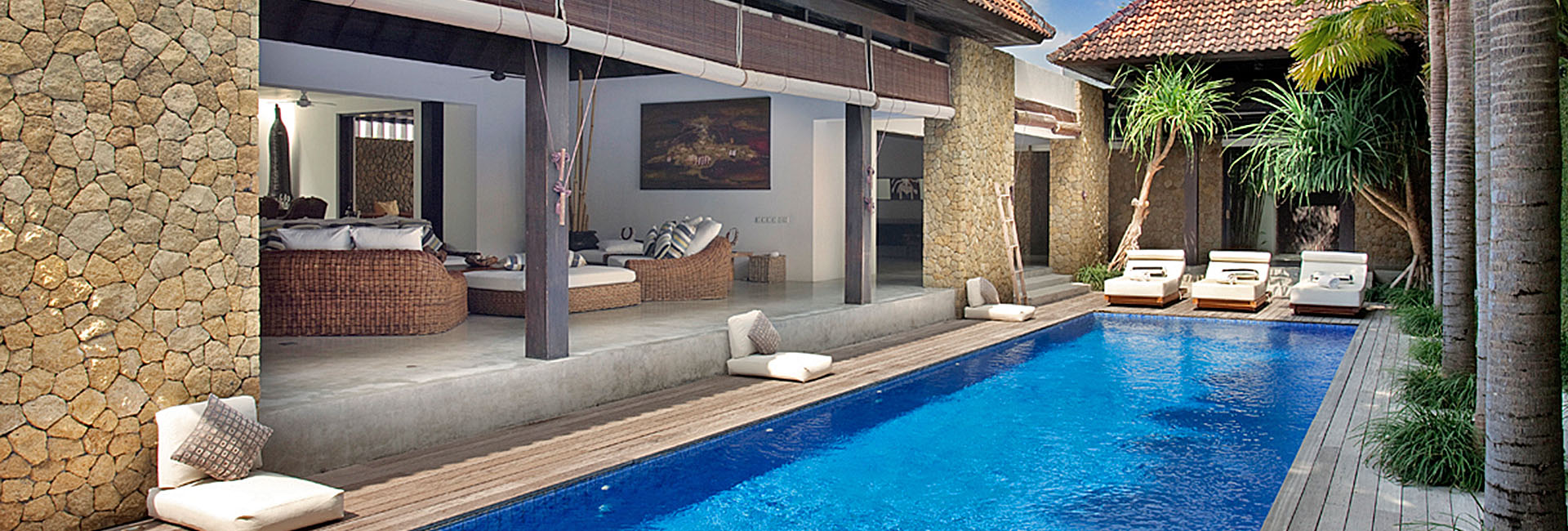 Villa Hana offers guests a breezy laid-back lifestyle within an easy stroll of Echo Beach. Fully staffed and with four private bedroom suites (including a double bunk room for kids), a large living pavilion, 15-metre pool, media room and barbecue terrace, it’s ideal for active families holidaying together, or for groups of friends drawn by Canggu’s noted surf breaks and sunset bar scene.