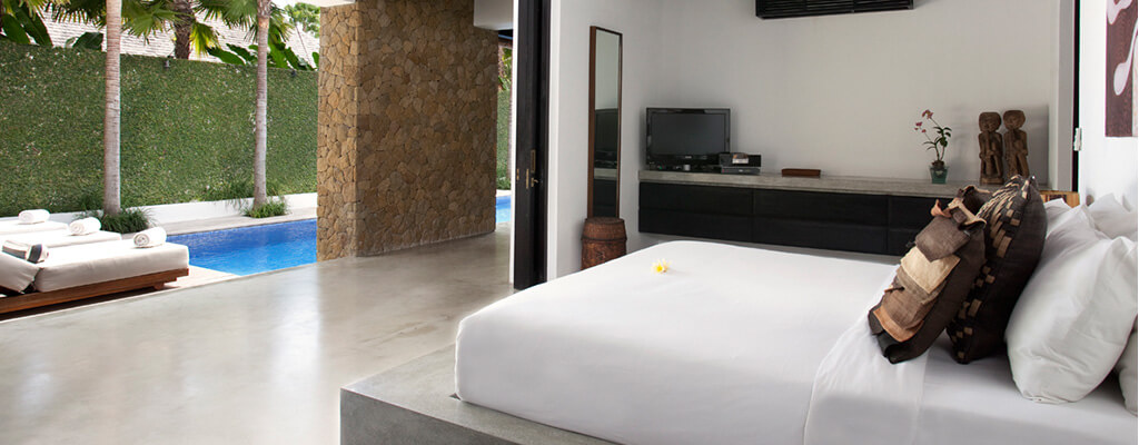 Both guest bedrooms are furnished with king-size beds on bases of polished concrete facing the pool. Each has an ensuite bathroom with semi-open-air shower.